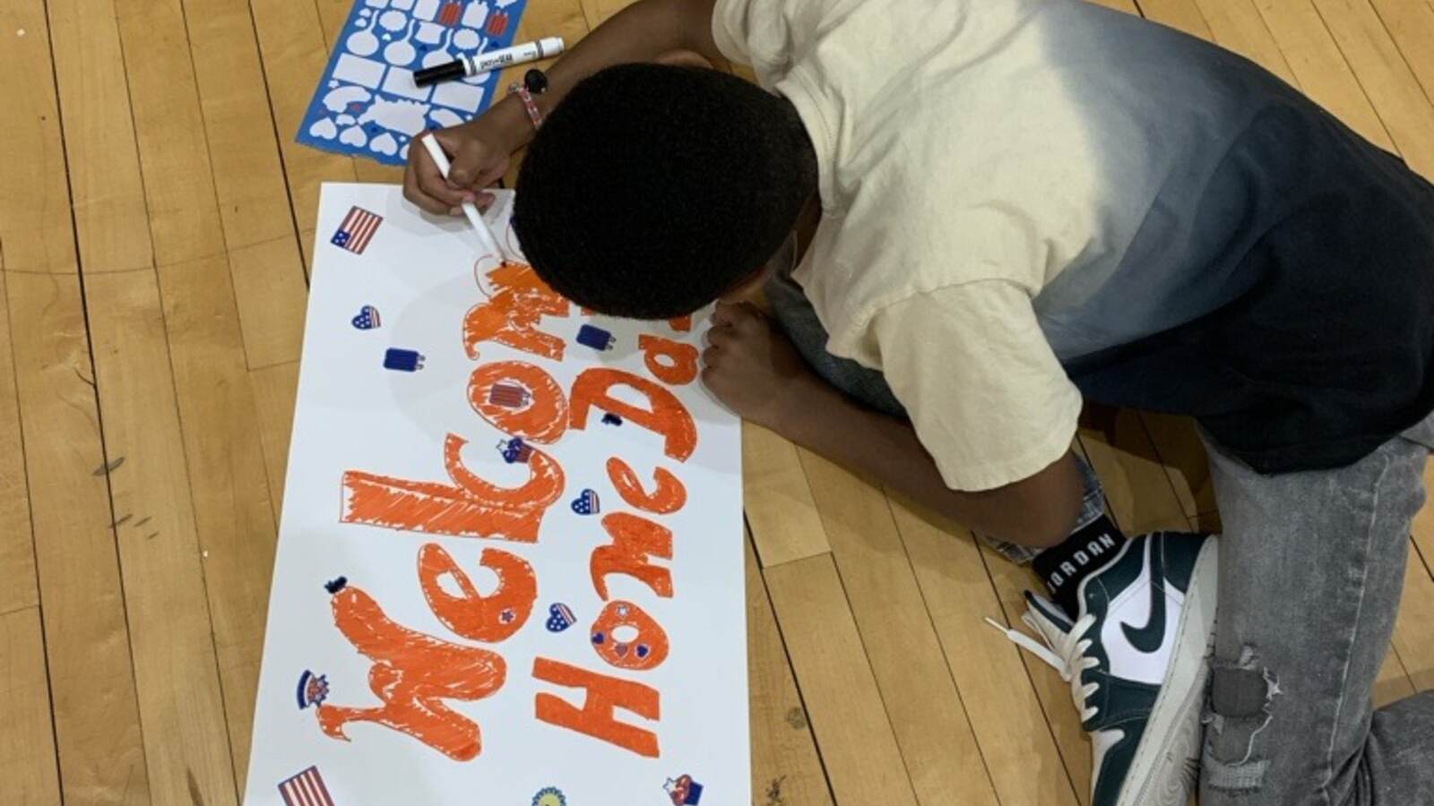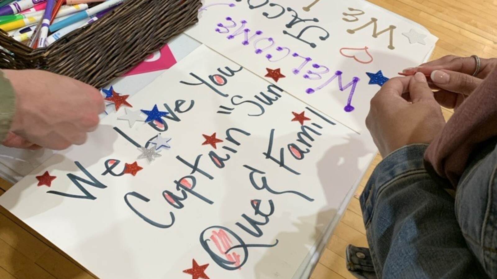 USO operations in Oklahoma joined families and friends to welcome home the 1-14th Field Artillery BN to Fort Sill from a deployment on May 30, 2026. It was not during “normal workday hours” as is true for much of the work of our mission. What made our program meaningful for this particular redeployment was our welcome home poster making table. Sometimes in the excitement of getting ready to see your Solider, taking the time to get poster supplies goes to the wayside. That’s where USO came through! USO Volunteers assisted families pass the time while creating something celebratory to hold for the occasion.